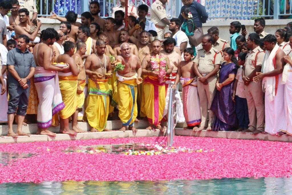 ఆలయంలో ఉదయం 4 గంటలకు సుప్రభాతంతో స్వామివారిని మేల్కొలిపి ఆలయ శుద్ధి, ఆరాధన నిర్వహించారు. ఉదయం 9.30 గంటలకు శ్రీ లక్ష్మణ సమేత సీతారాములవారు తిరుచ్చిలో, సుదర్శన చక్రత్తాళ్వార్ పల్లకిలో ఊరేగింపుగా పుష్కరిణి వద్దకు వేంచేశారు.